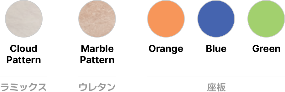 01 ラミックス雲柄 : 強い耐水性と耐熱性、耐湿性、耐スクラッチ性を持った独自開発の高強度天板で、抗菌99.9%の環境にやさしい素材の天板です。
